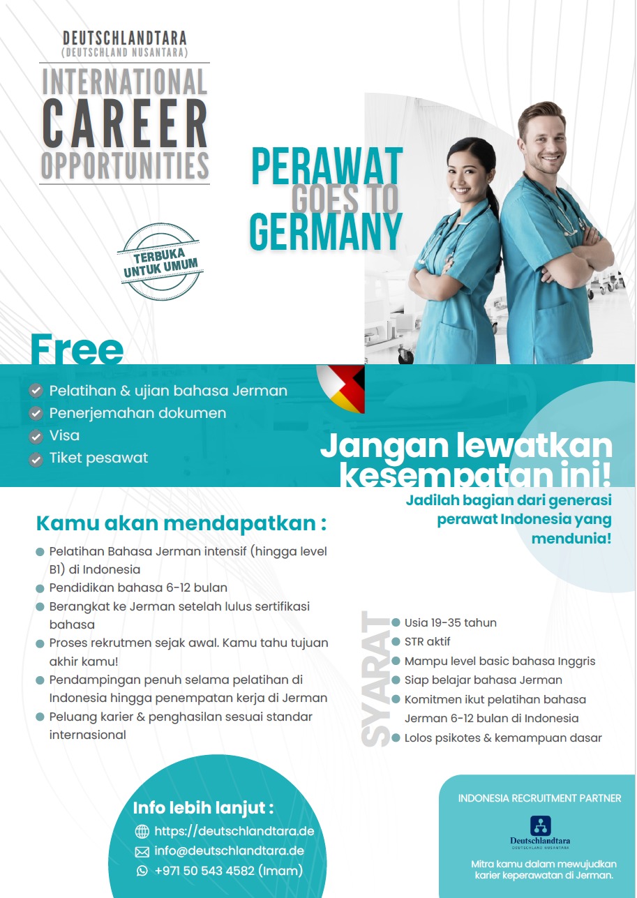 Bagi perawat Indonesia yang serius kepengin kerja ke Jerman silahkan kirim CV ke nomer di atas> Pelatihan bahasa gratis sampai B2 secara online. Tidak ada processing fee, gratis.